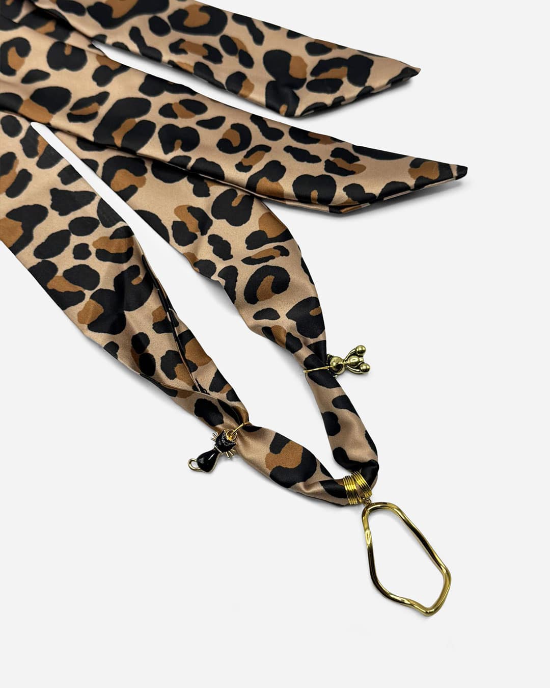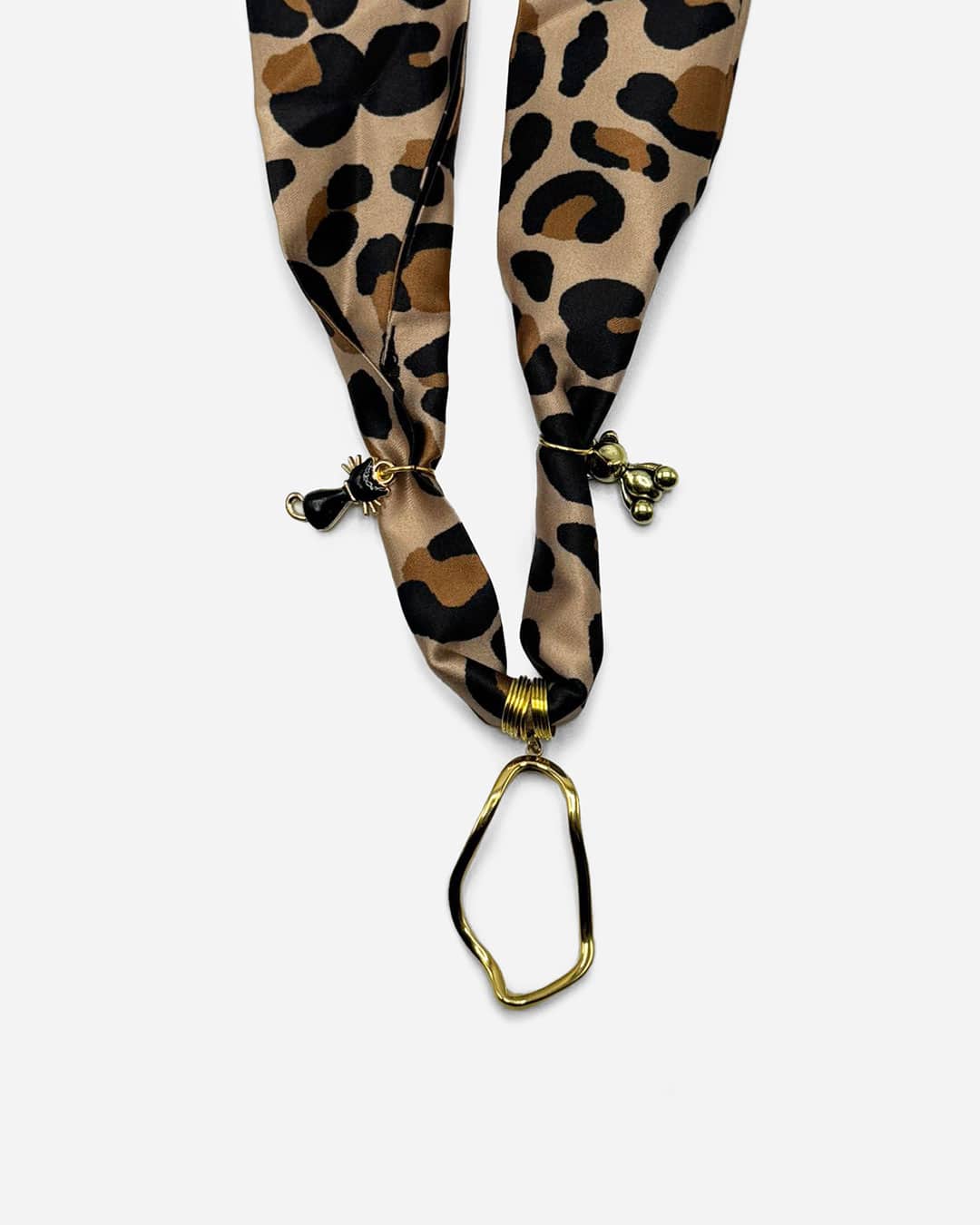 Eleve os seus looks com o nosso Colar de Cetim em padrão leopardo! Pode combiná-lo com um par de chinelos Dango do mesmo tecido. Produzido de forma artesanal e à mão, são feitos com tecido confortável e pendentes leves, para se sentir confortável no seu dia-a-dia.