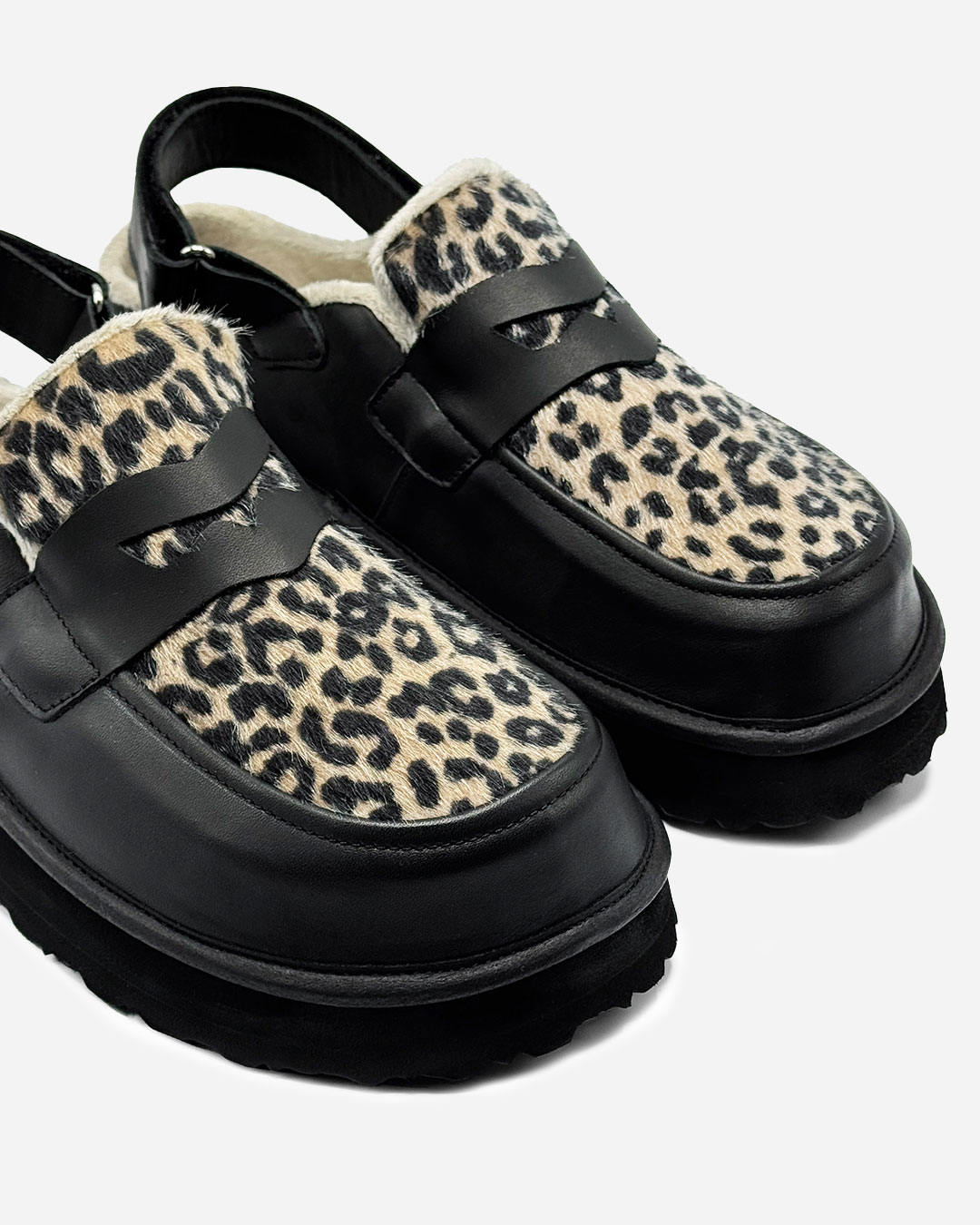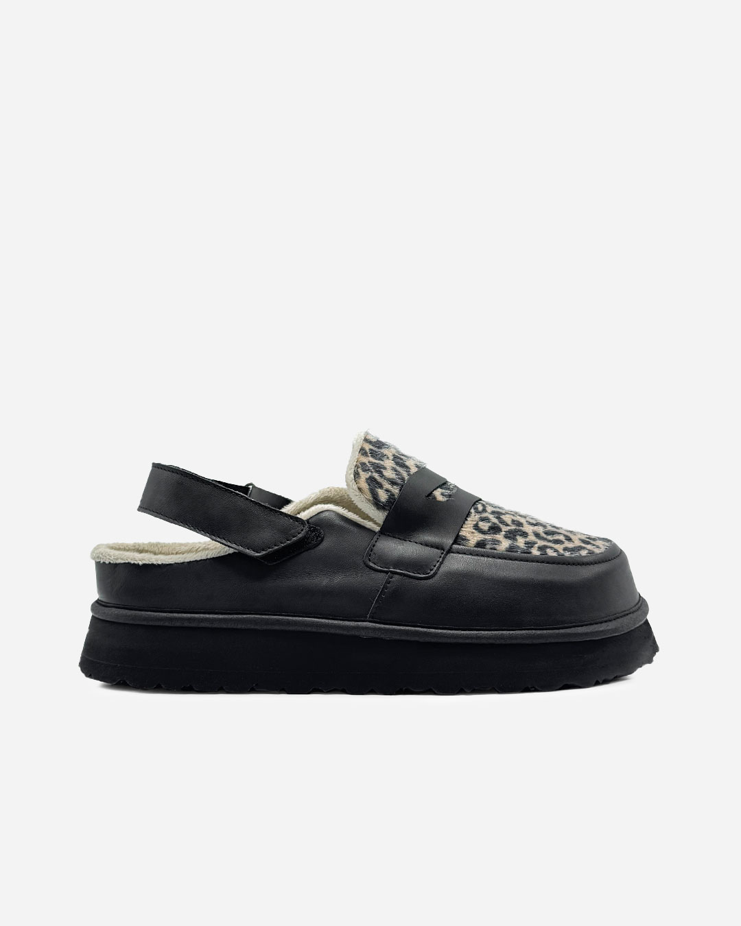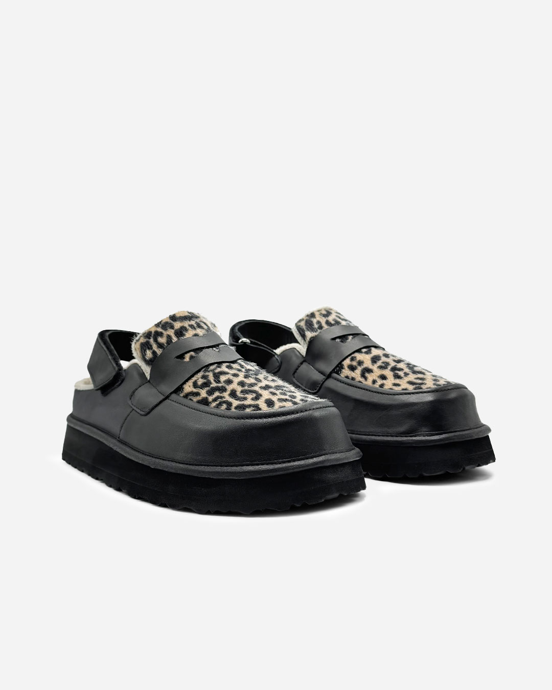 Os nossos Mules de Plataforma em pele, com pele tigrado, são pensados para quem procura elegância e conforto. Possuem design minimalista e um acabamento cuidado.