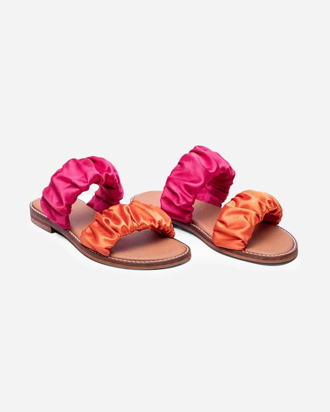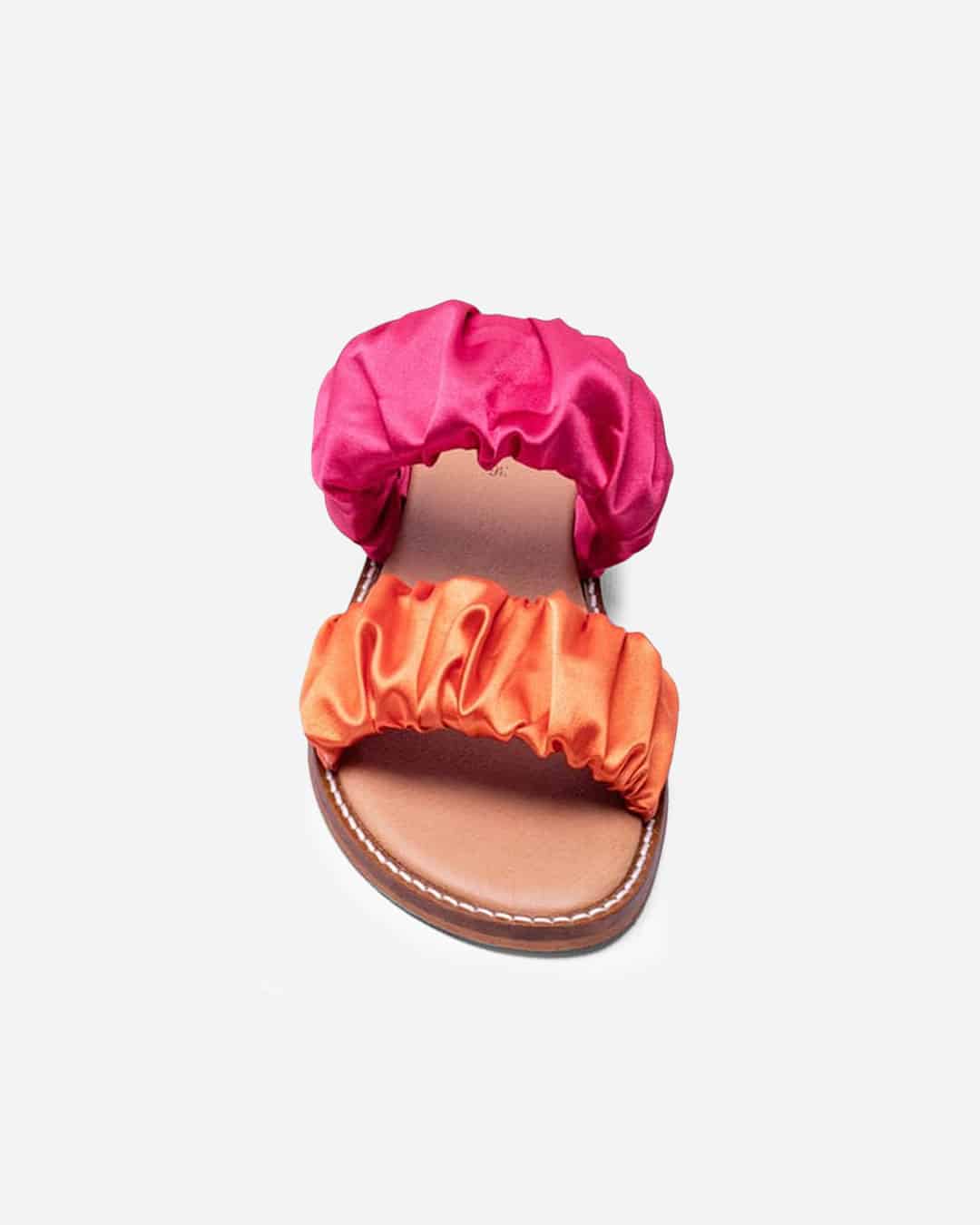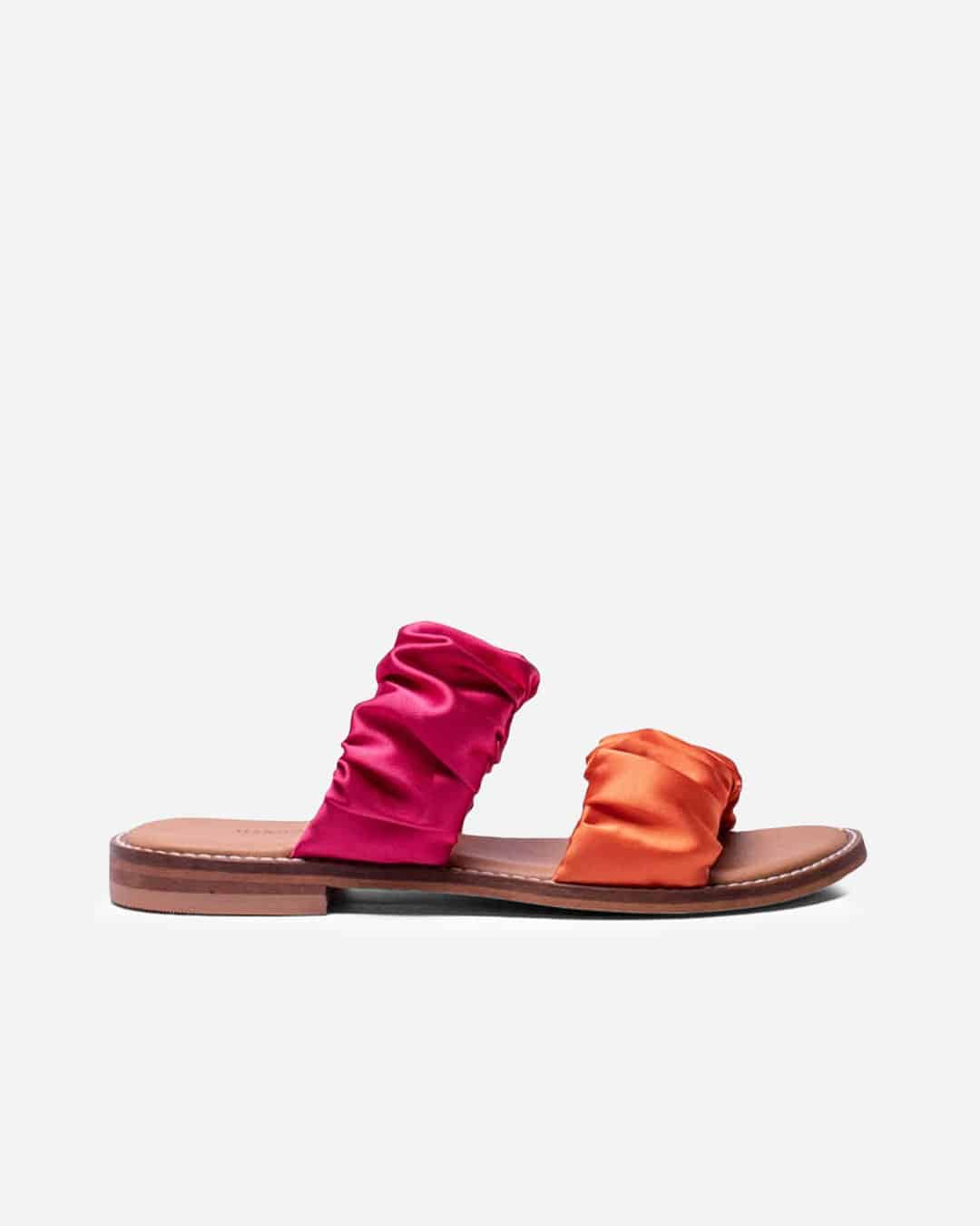 Chinelo Dango com tiras cetim rosa e laranja, e sola baixa, extremamente confortável para o dia-a-dia.